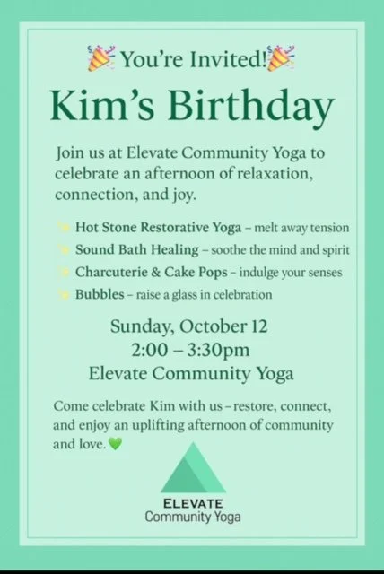 Join us at Elevate Community Yoga to celebrate Kim’s Birthday with an afternoon of relaxation, connection, and joy.