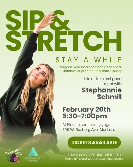 Join us for a cozy, feel-good Sip & Stretch fundraiser with the one and only Stephannie Schmit at our favorite community yoga space, Elevate Community Yoga.