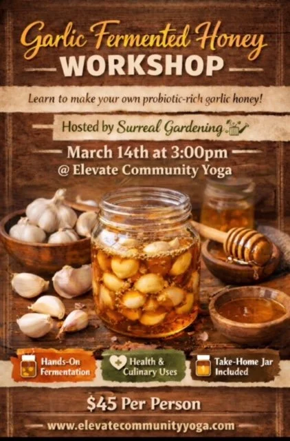 Join us for a hands-on workshop where you’ll learn to make your own jar of garlic fermented honey—a probiotic-rich, immune-supporting remedy with delicious culinary uses. Together we’ll lightly crush fresh, unpeeled garlic cloves, cover them in raw honey, and walk through each step of the fermentation process. You’ll learn how to safely “burp” your jar, store it in the right environment, and keep the cloves fully submerged as they transform over the coming weeks. We’ll also explore its sweet, savory flavor and how to use it for immune support, digestion, or adding gourmet depth to dishes like pizza, salads, and roasted veggies. Every participant takes home their ready-to-ferment jar to continue the process at home.