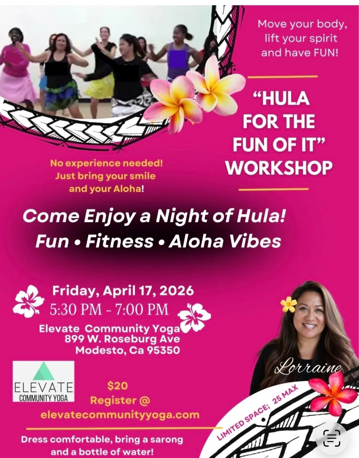 Join us at Elevate Community Yoga for a lively and heart-warming evening of Hula with Lorraine! This beginner-friendly workshop blends fun, fitness, and island spirit in a welcoming, supportive space.